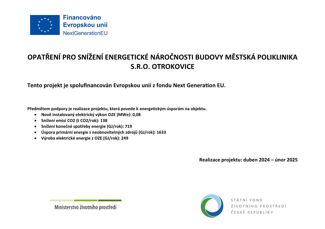 Městská poliklinika v Otrokovicích realizuje významný projekt energetických úspor, který je spolufinancován Evropskou unií z fondu Next Generation EU. Projekt zaměřený na snížení energetické náročnosti budovy přinese řadu pozitivních environmentálních a ekonomických dopadů.